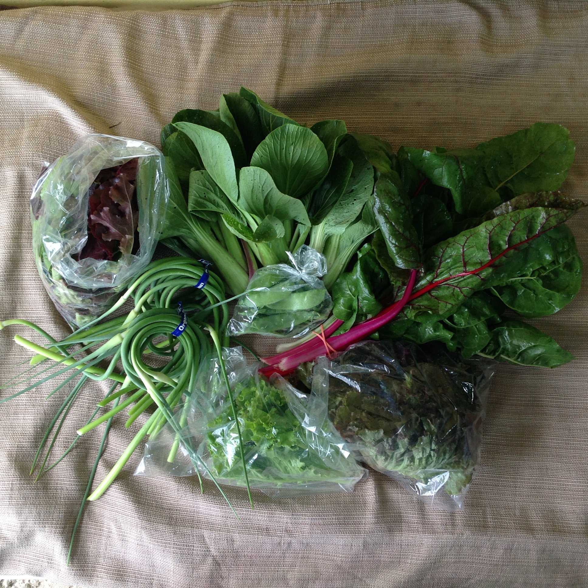 Baby Lettuce Mix - great for salad, sandwiches, wraps Garlic Scapes Swiss Chard Bok Choy Lettuce - heads Hakurei Turnip with Greens LARGE ONLY: Snow Peas